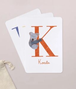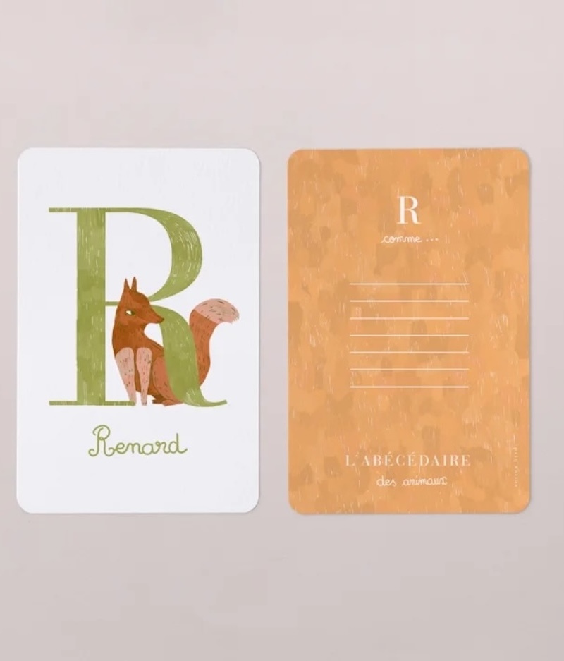 Chaque carte joliment illustrée présente au recto une lettre accompagnée de son animal « totem », et offre au verso un espace pour que votre enfant note d’autres mots ou dessins commençant par la même lettre.
