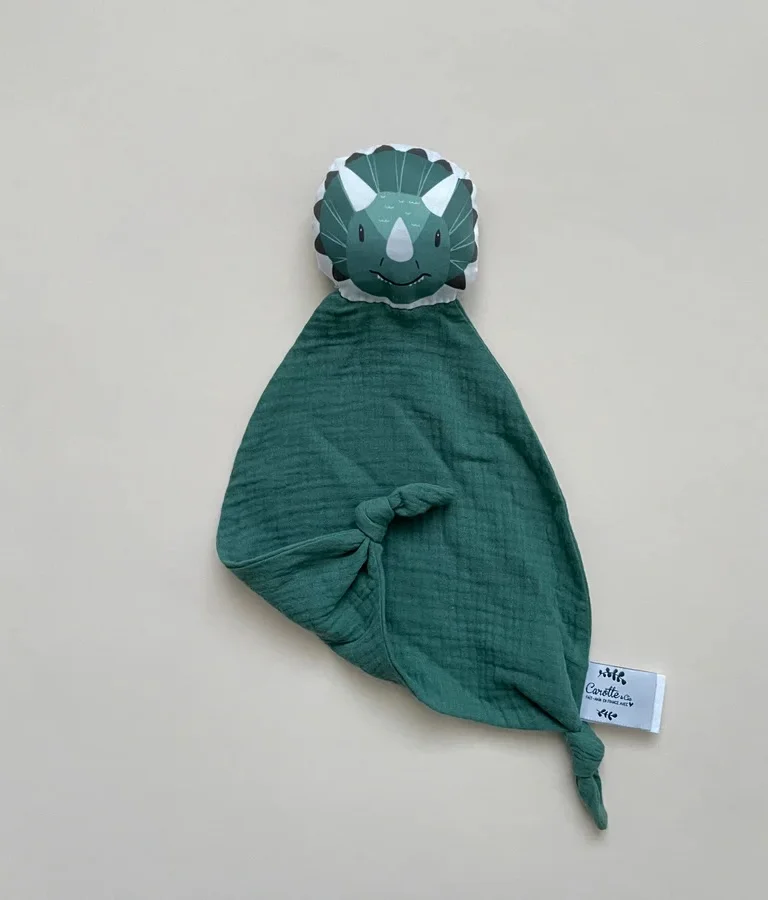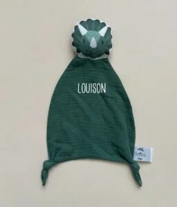 Offrez à bébé un compagnon doux et réconfortant avec ce doudou Dinosaure en double gaze vert eucalyptus Carotte & cie.