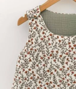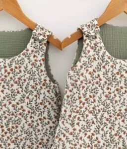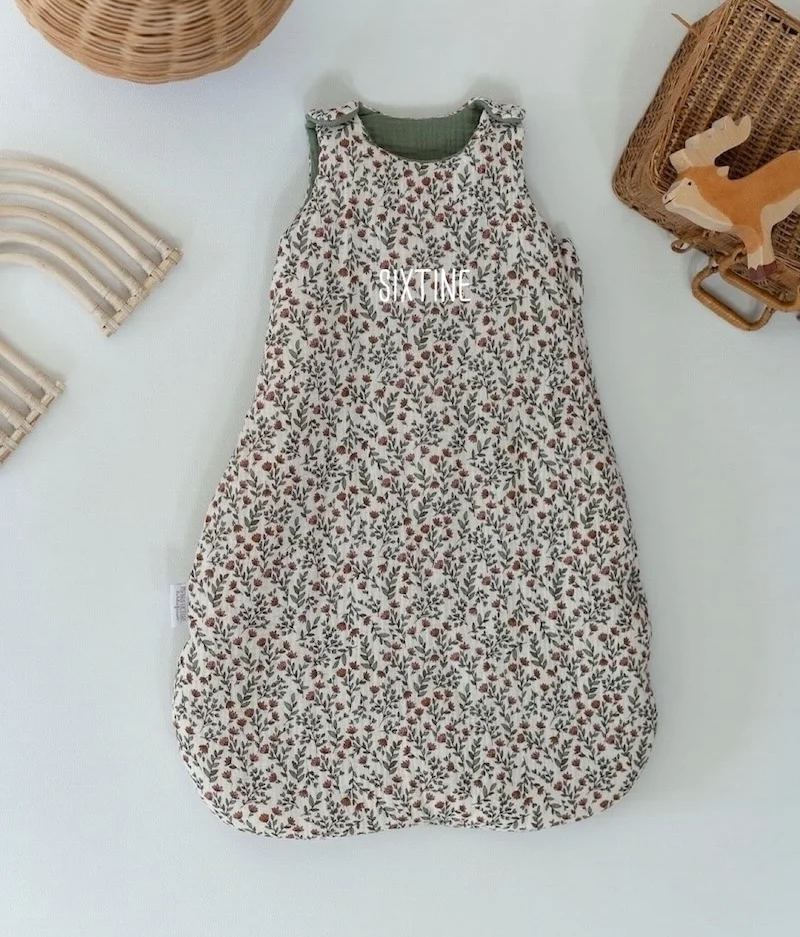 • Extérieur en double gaze de coton Madeleine écru à motifs fleuris vert et intérieur en double gaze de coton uni vert sauge certifiées sans substance nocive.