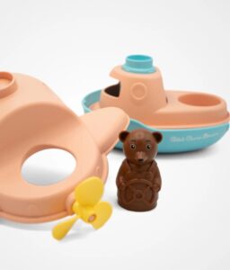 À l’intérieur se cache un petit bateau détachable, parfait pour le bain ou les jeux d’eau.