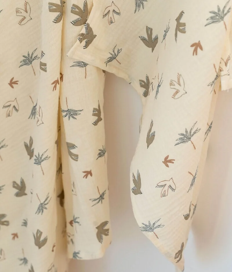 • Double gaze de coton écru à motifs oiseaux certifiée sans substance nocive ou irritante.