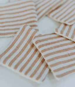 • Composées d’un côté d’éponge écru super absorbante 100% coton, et de l’autre côté d’une double gaze à rayures caramel.