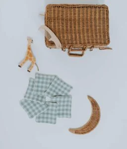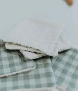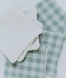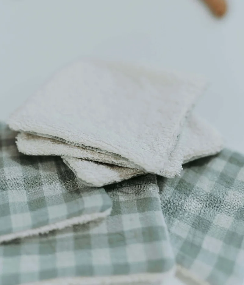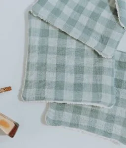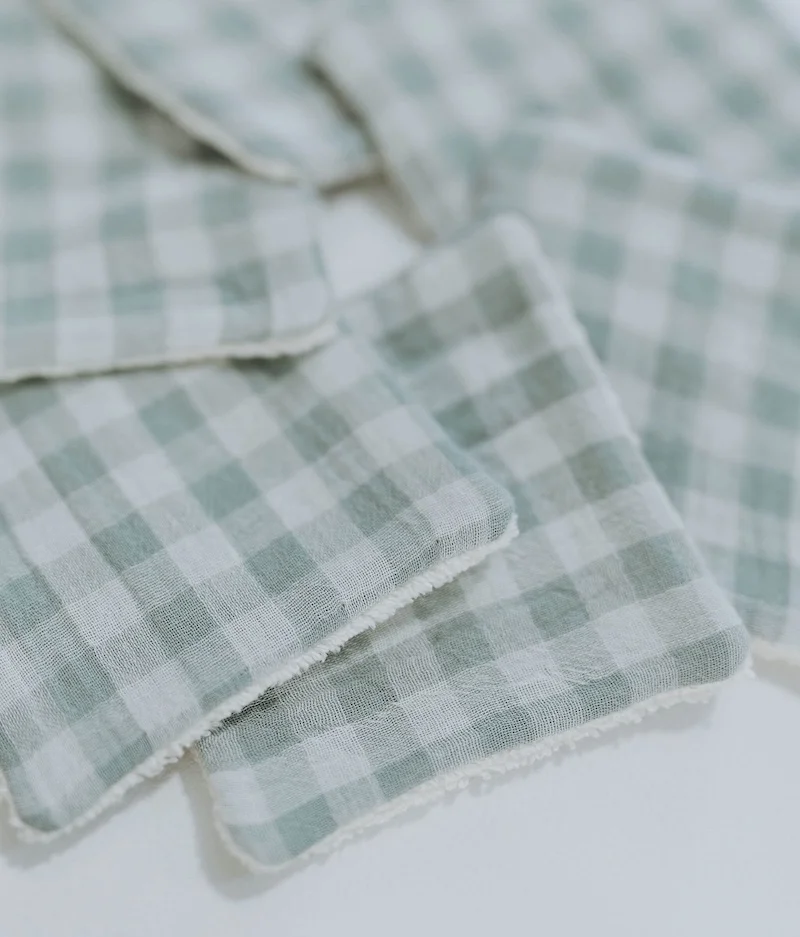 • Composées d’un côté d’éponge écru super absorbante 100% coton, et de l’autre côté d’une double gaze vichy vert de gris.