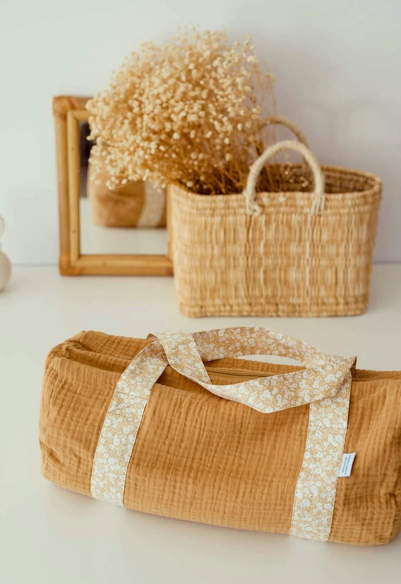 Il est composé à l’extérieur de double gaze de coton et de 2 anses porté épaule en coton ainsi que d’une grande ouverture zippée. Son intérieur en coton enduit imperméable couleur écru le rend très facile d’entretien et d’utilisation, votre bambin peut ainsi transporter facilement ses petites affaires de piscine humide par exemple.