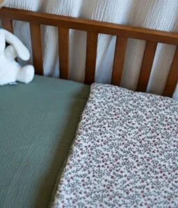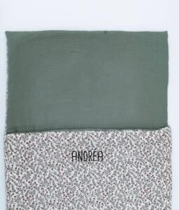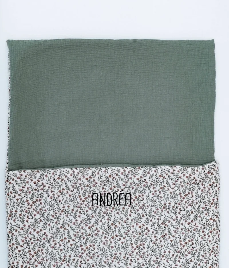 • Extérieur en double gaze de coton Madeleine écru à motifs fleuris vert et intérieur en double gaze de coton uni vert sauge certifiées sans substance nocive et ouate hypoallergénique.